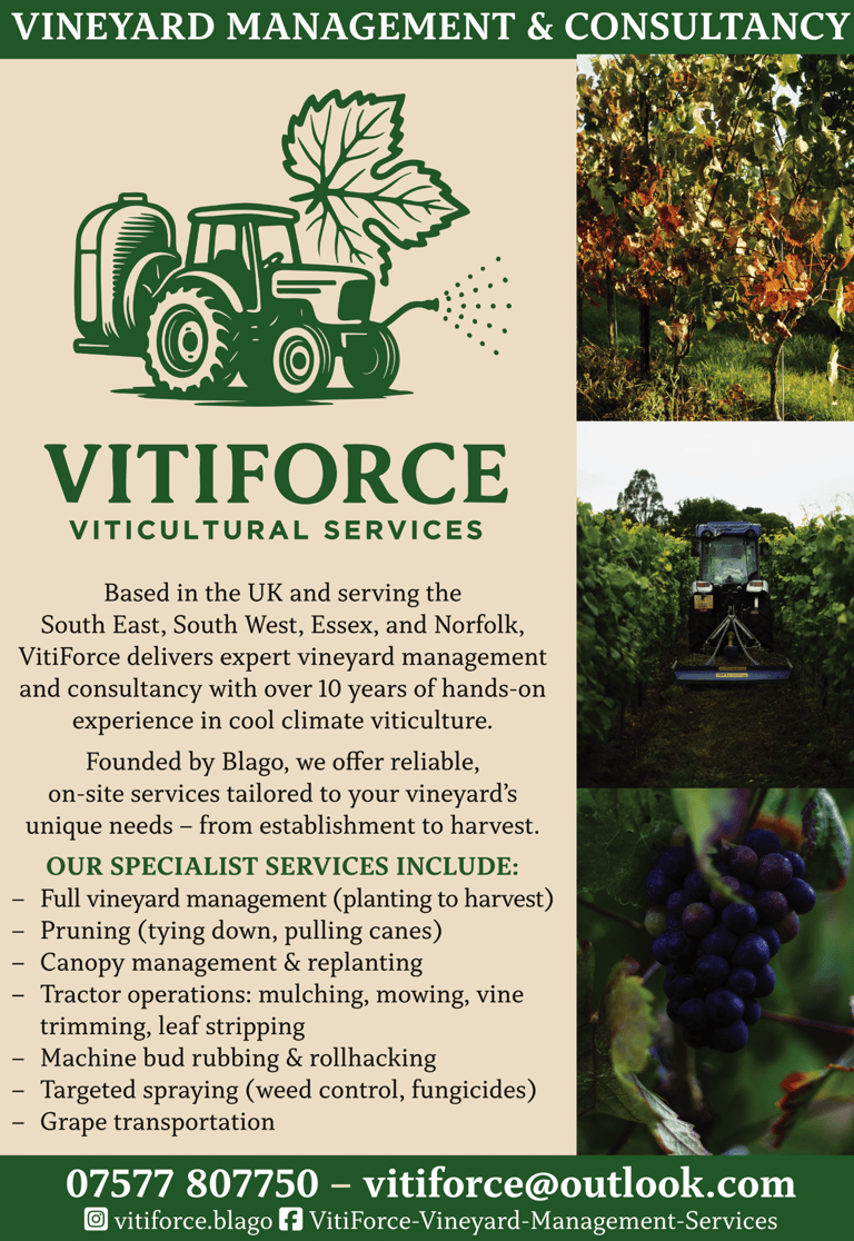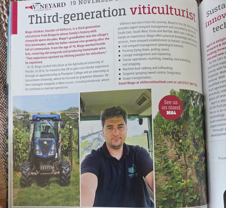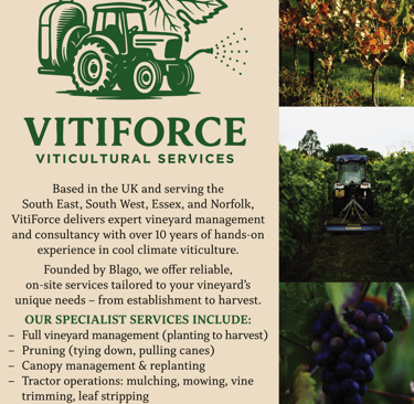 VitiForce was born from this journey. Based in the UK, we provide expert vineyard management and consultancy across the South East, South West, Essex, and Norfolk. With over a decade of hands-on experience, I offer practical knowledge and reliable services — from vineyard establishment to harvest.